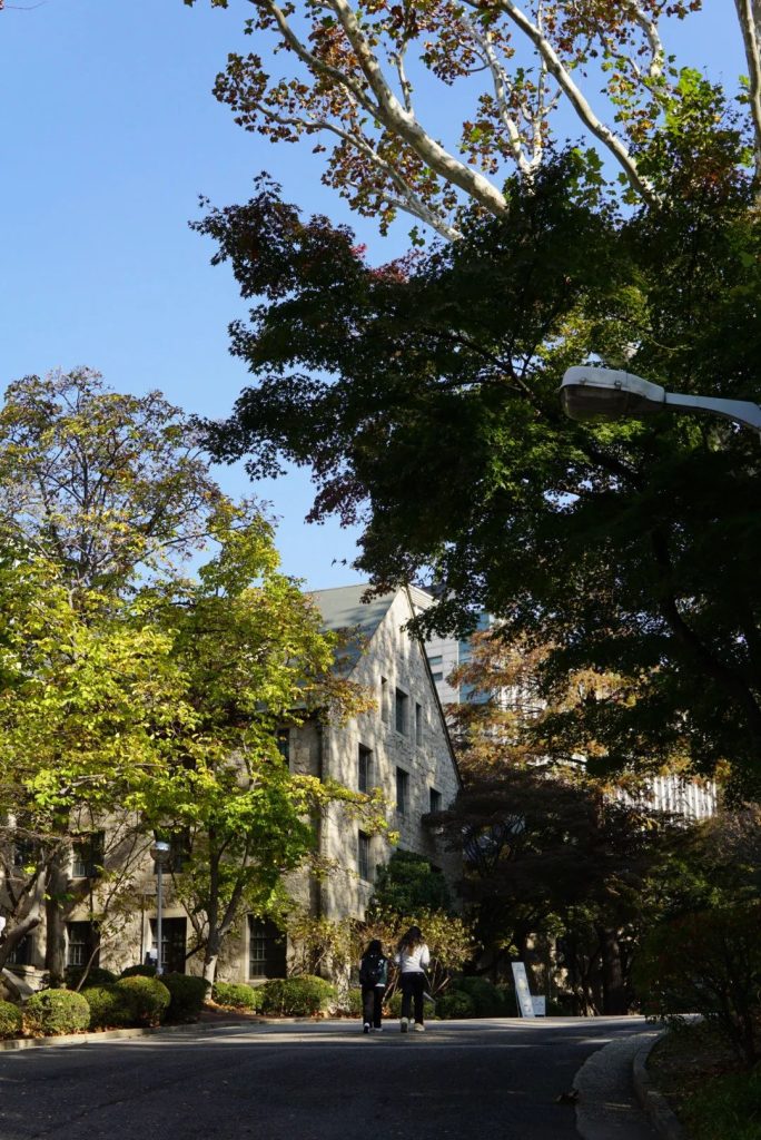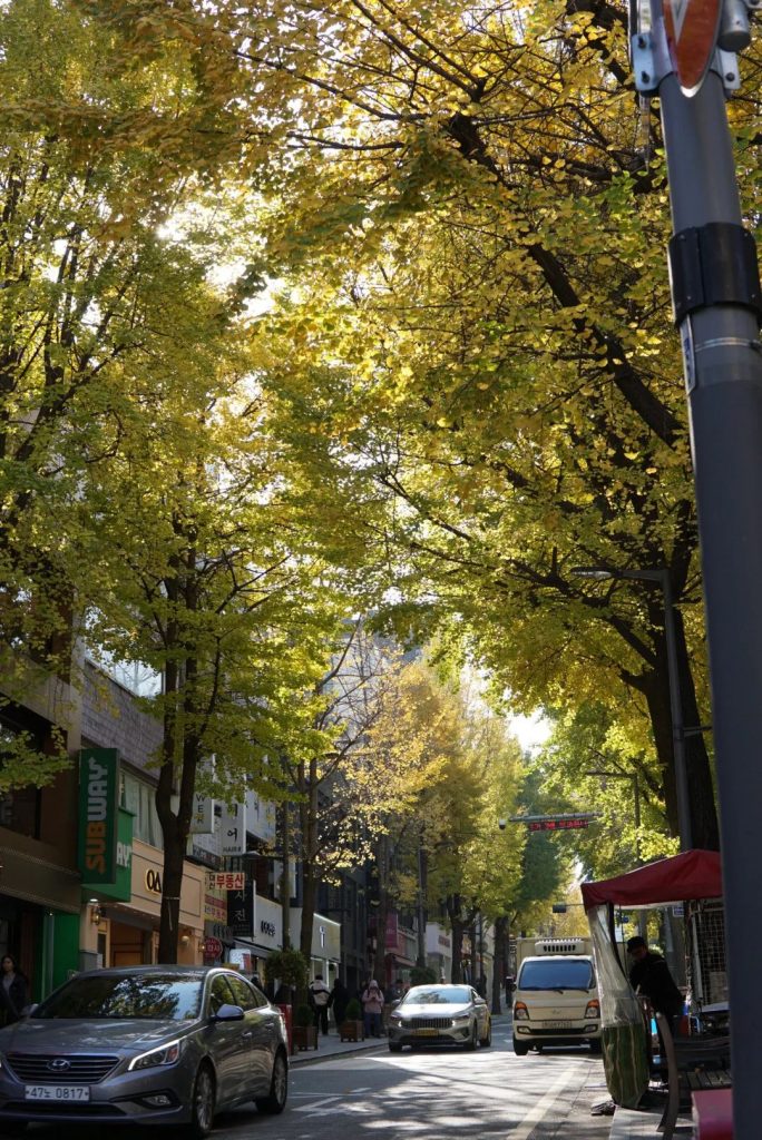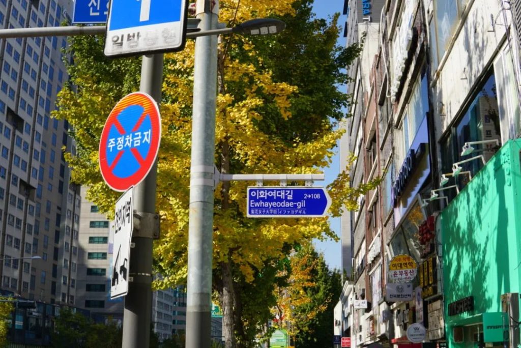 梨花女子大学离弘大只有两个地铁站的距离。链接学校大门和地铁站的是一条长长的下坡路,两边都是银杏树还有许多饮品店。