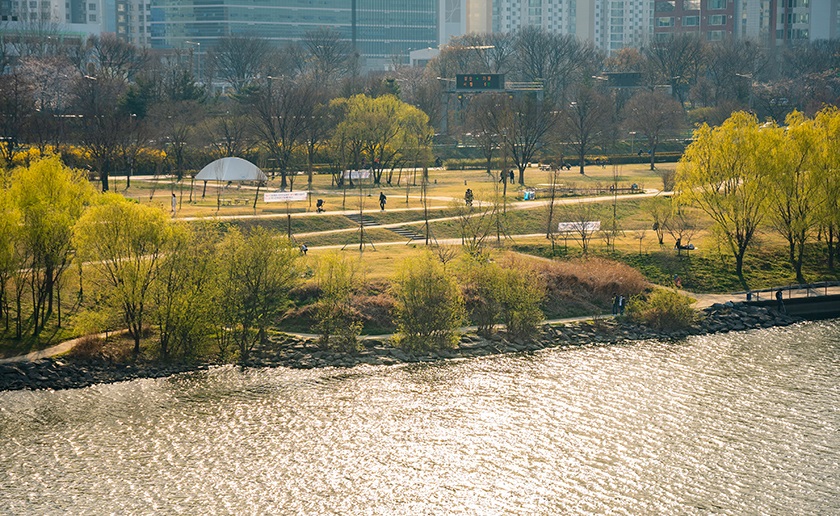 杨花大桥并不适合走上去,也有天气太冷的缘故,我们坐公交穿过了这座横跨汉江的第一座桥,开往汝矣岛汉江公园。