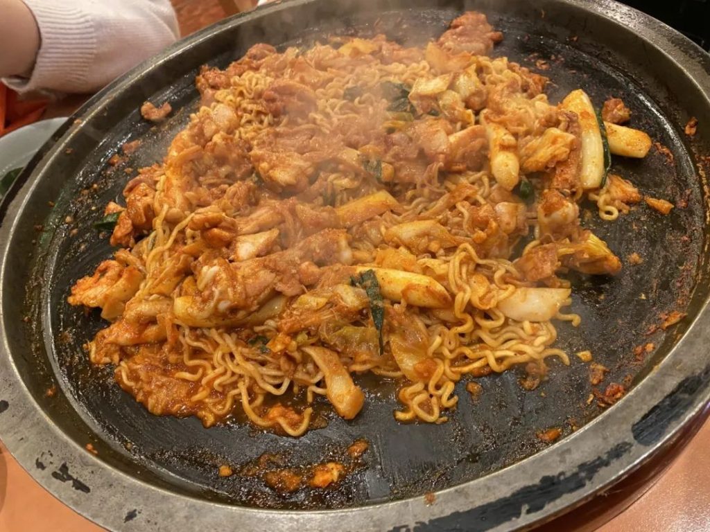 我们偶遇到一家小红书上很火的餐厅,金希澈文俊辉林一都来过,我们还恰巧坐在了朋友喜欢的金路云他们团曾经做过的位置上。这里基本上没啥可点的,服务员直接给你来一份人头算的炒鸡,然后我们加了一份拉面伴着吃。