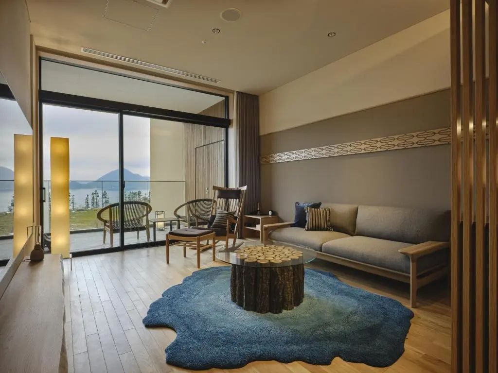 酒店仅有11间客室,共有三种房型可选,面积均在100平方米以上,皆为配备了松岛温泉的套房,无论是在卧室或是温泉处,放眼望去,便是天草松岛的碧海与星罗棋布的群岛交织的美景,幽静深邃,美不胜收。