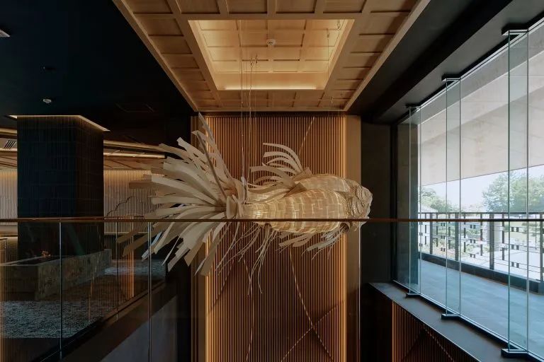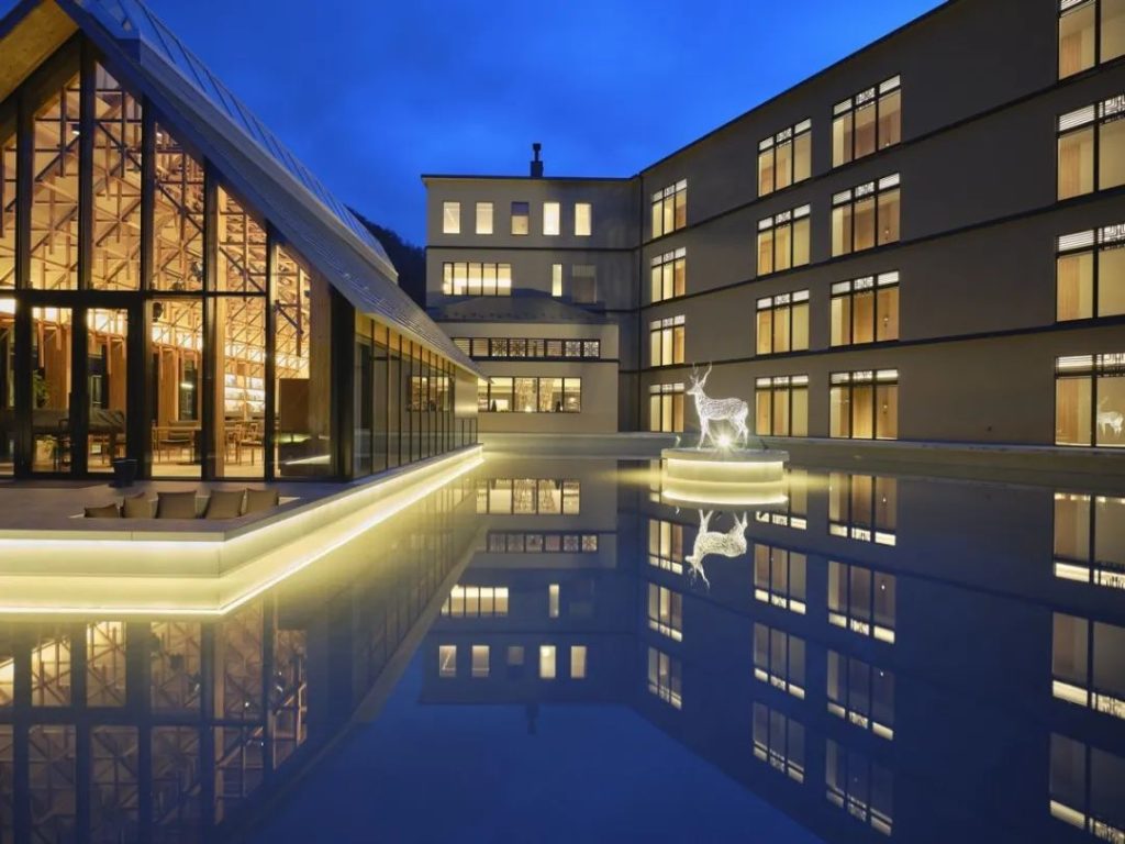 旅馆在一楼及六楼分别设有温泉大浴场及家族私汤,并可将溪谷的季节美景尽收眼底。在一楼庭园正中则是开阔的观景露台,举目可见群山叠翠,夜间还将点起篝火,亮起灯光,在朦胧山色环绕中,别有一种意境之美。
