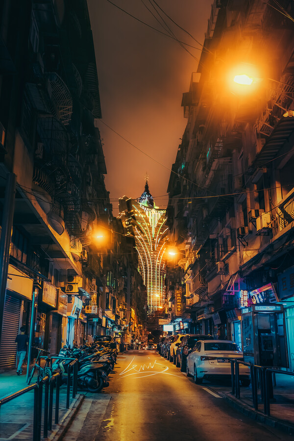 机位就在马路边,拍照的时候一定要注意安全!建议晚上9-10点的时候去,这个时段来往的车辆不会太多,能拍到不远处在夜色里妖娆的新葡京和生活气息浓郁的老旧街道形成的巨大视觉反差。