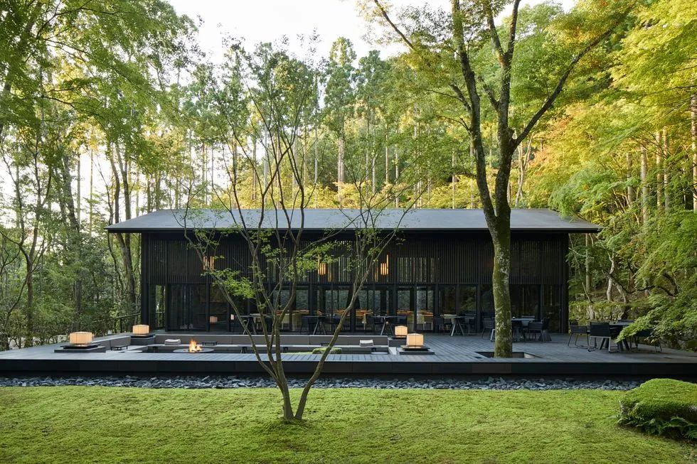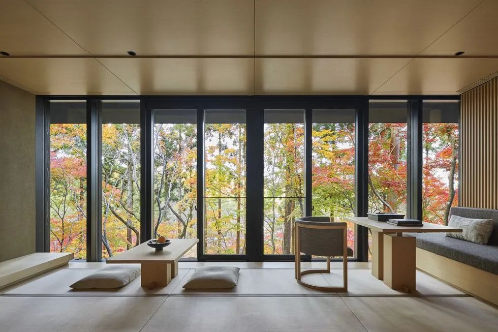 Aman Kyoto 的客房和亭台是对传统日本旅馆旅馆的现代致敬,其几何结构极简主义,可作为通往其壮观自然环境的窗户。