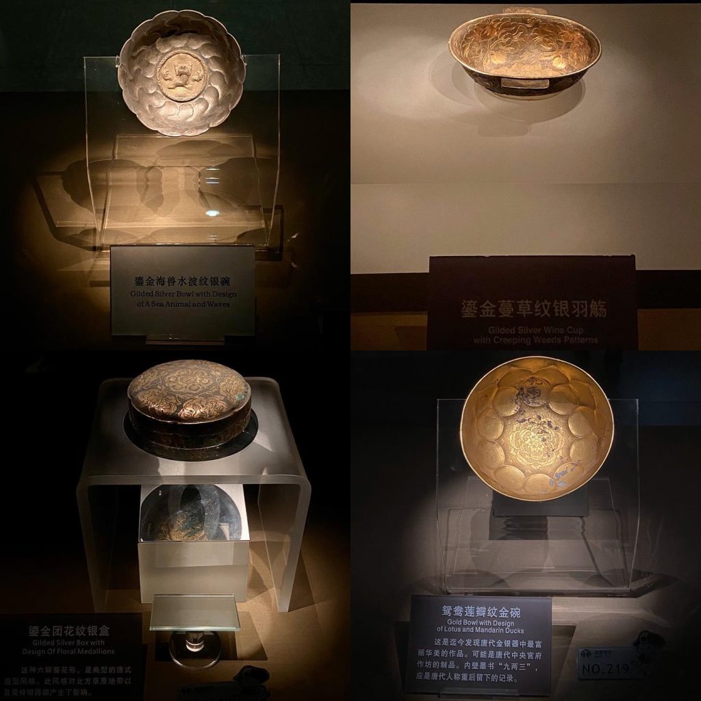 - 唐代——三彩载乐驼、鸳鸯莲瓣纹金碗、鎏金鹦鹉纹提梁银罐、镶金兽首玛瑙杯、鎏金舞马衔杯纹银壶、客使图、阙楼仪仗图、宫女图、马球图、狩猎出行图