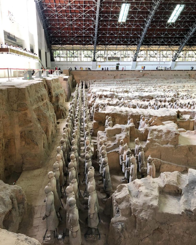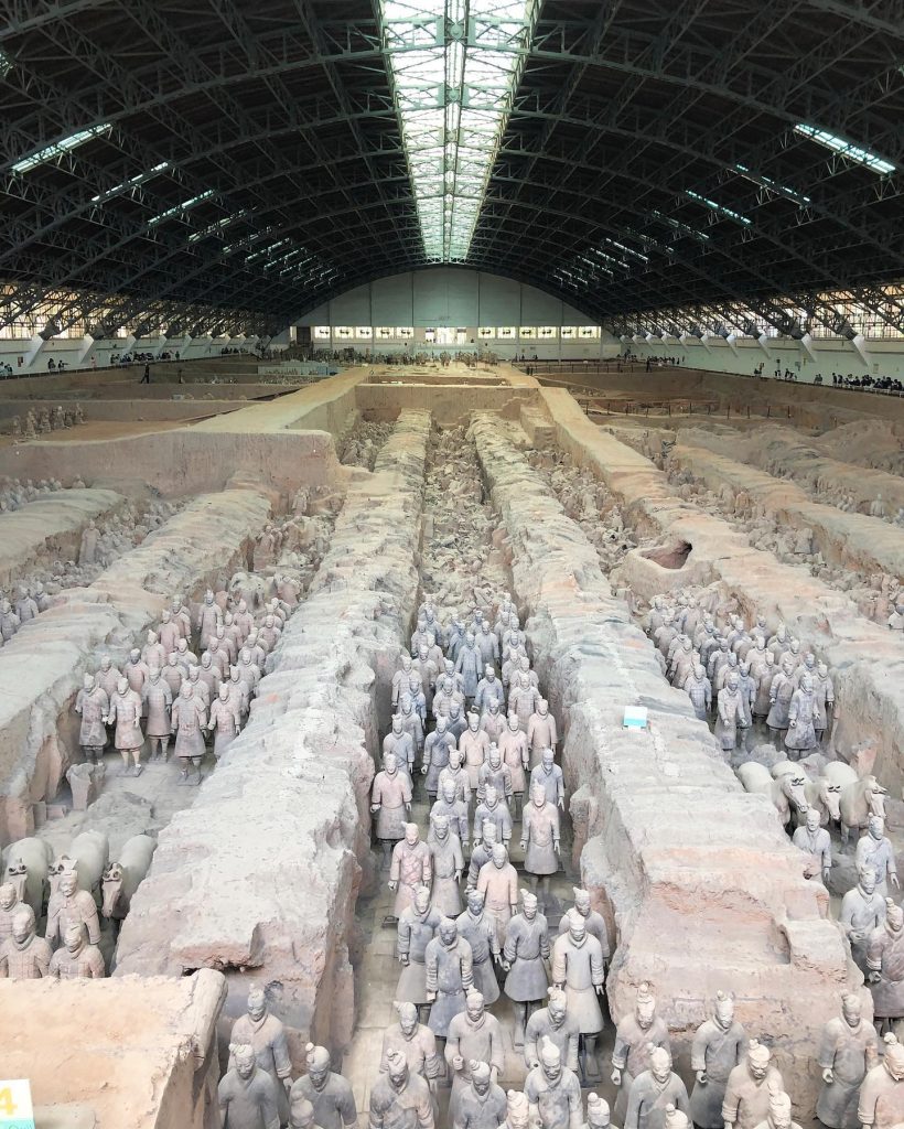 兵马俑坑是秦始皇当年浩荡大军的艺术再现。兵马俑在制作时为鲜艳的彩色,分别组成了步、弩、车、骑四个二兵种,出图后颜色脱落。