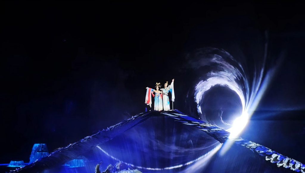 它以骊山山体为背景,以华清池九龙湖做舞台,以亭、榭、廊、殿、垂柳、湖水为舞美元素,营造了万星闪烁的梦幻天空,滚滚而下的森林雾瀑,熊熊燃烧的湖面火海以及三组约700平米的LED软屏和近千平米全隐蔽式可升降水下舞台,将历史与现实相交融,演绎了一篇千古传奇。