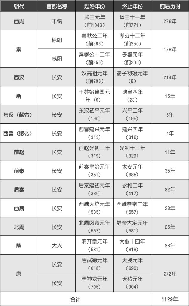 自西周“武王讨纣”后建立周王朝以镐京为都开始,历经秦王朝的崛起和“秦始皇统一六国”,刘邦开创大汉王朝,直至李渊在长安称帝建立唐朝(武则天曾移都洛阳建武周朝),西安的建都史有1100多年。
