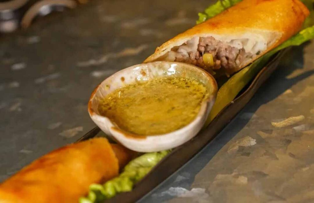 「羊肉春卷」主要用到羊膝加入紫苏、洋葱炒香,包成春卷后不是炸制而是煎制,外皮够薄脆,而内里还保有丰沛肉汁,让羊脂香气相当突出。
