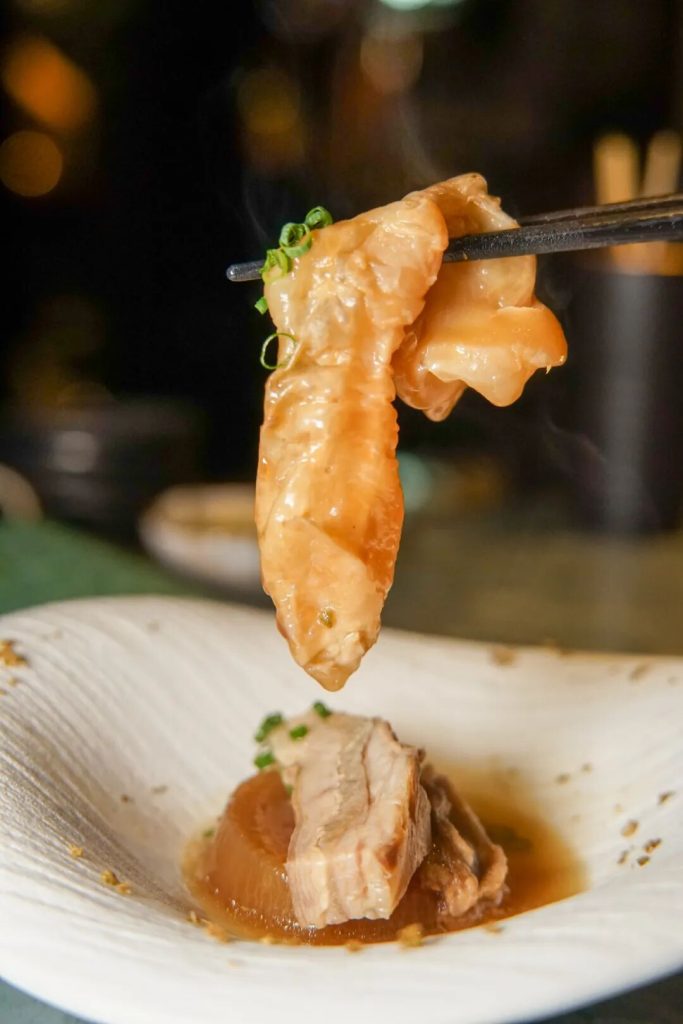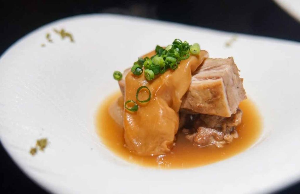 说的是这道「鱼羊汤炖花胶」,同样是汤,但换了不一样的羊汤基底,先用到四种日本鱼干如鲣鱼、池鱼等先制作出汁 ,再入羊骨熬制,以此煮花胶,所以汤头有了更幽深的层次。大概也是加了出汁,整个汤体区别于传统羊汤的复合香料感,喝起来更温和回韵。