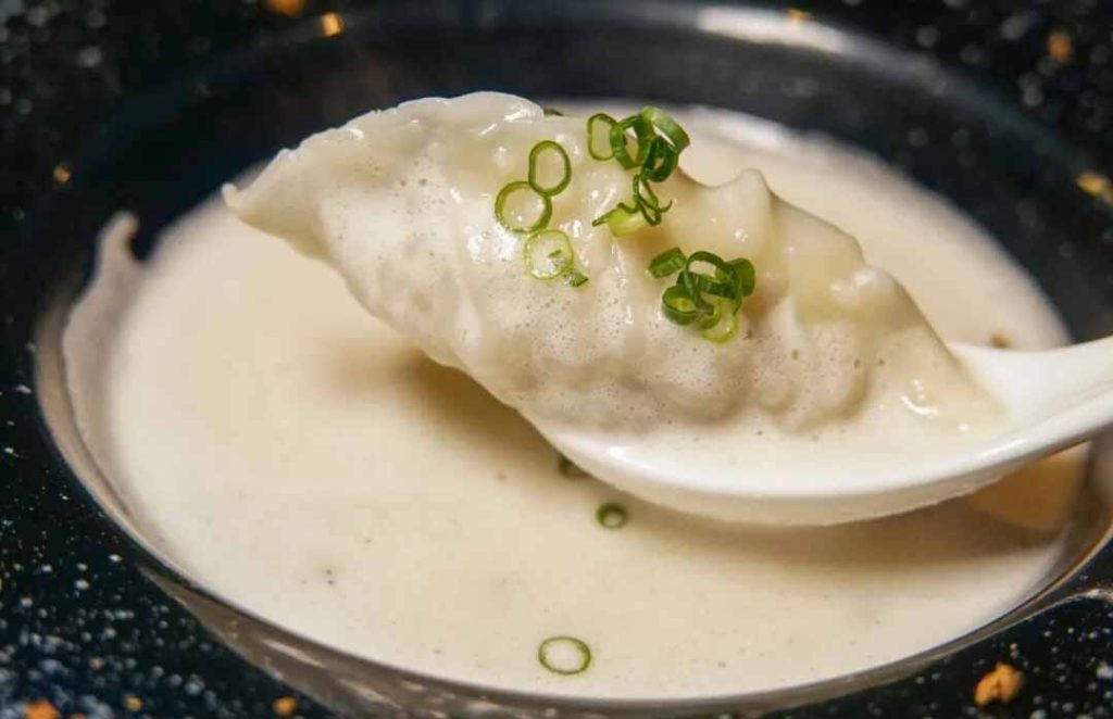 还有一道「羊汤月令海韵饺」,就是在羊肉汤的基础上增加搭配,用至少1/4羊搭配适量香料熬制6小时,熬出奶白色的羊汤,香气氤氲,口感顺滑,再加入灌汤饺,饺子馅根据时令切换,这天吃到的是黄花鱼馅,便能撞出鱼羊鲜。
