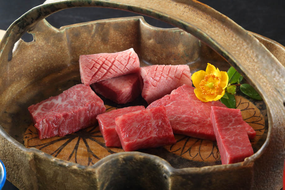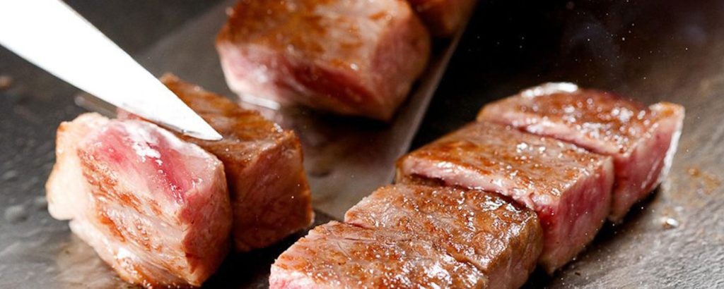 由专业的人在你面前专业地以六面烧的技巧烹调神户牛,并一道一道地为您料理。
