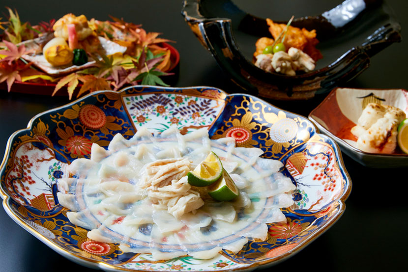 臼杵出产的河豚是为名品中的名品,肉质十分鲜嫩很难切成薄片处理,因此臼杵的河豚肉也以厚度闻名。能在此品尝到最极致的河豚料理。获得米其林二星殊荣的河豚料理相当的稀少,虽然本店在大分县,但在西麻布店一样可以品尝到与大分当地同样品质的河豚料理。