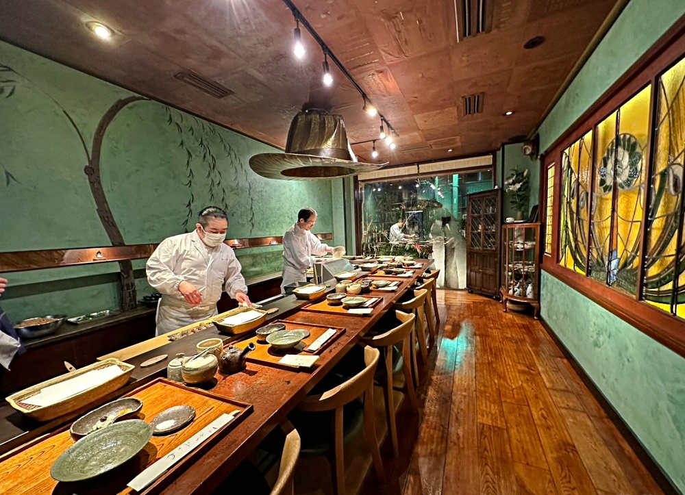 八云茶寮将位在闲静的住宅街中的大宅院整修翻新。有一个能感受四季变换的庭院、做料理跟用餐的桌子是一体成形的大吧台式餐桌,还有一个可以眺望庭院的餐桌、以及令人身心放松的品茶茶房空间。