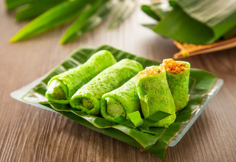 • 九层糕,又叫马来千层糕,色彩鲜艳,吃起来口感软糯,甜而不腻也不粘牙,带有淡淡的班兰香味和椰浆味。