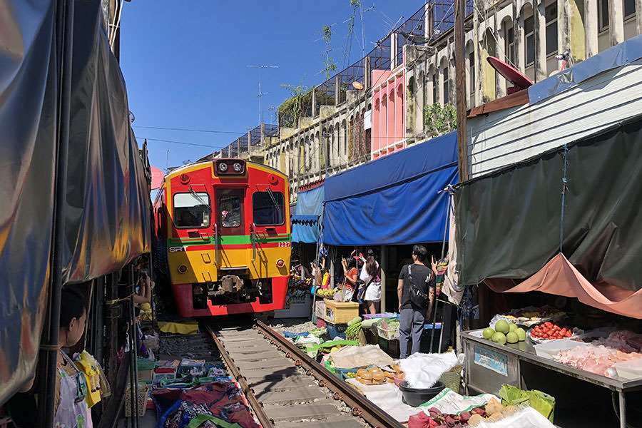 特点:摊商紧贴着铁轨两旁摆摊营业,铁路就是市场的一部份,当火车鸣笛响起就可以看到摊贩把帐棚全部收起,火车通过后摊贩打开帐棚继续营业,这前后不到五分钟的奇特景像吸引了无数的观光客前来体验非常有趣热闹。