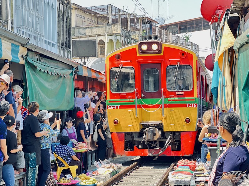 美功铁路市场是泰国曼谷近郊的一个小市场,也是最多曼谷观光客朝圣的火车市集,最为人津津乐道的是「看着火车直行传统菜市场」的震撼,窄小市集瞬间收棚,实在觉得摊贩很忙,要卖东西又得躲火车,所以成为人们前来打卡的网红市场。美功铁路市场一天只有4班车、来回8个时段有火车经过,当地传统市场直接设在车站延伸出去的一小段铁轨,这旁算是早午市,傍晚来没得逛没法体验火车穿梭在市集里的乐趣了,想体验真的要看对时间亲自走一趟!
