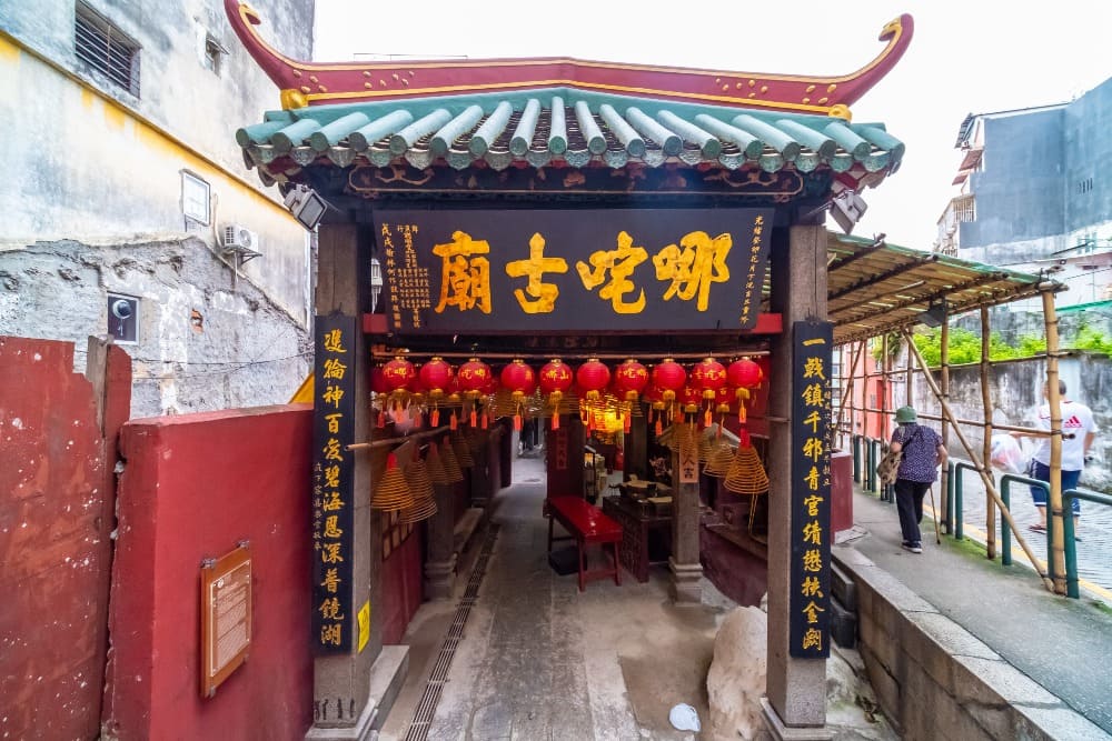 刚在关帝庙看完关二爷的青龙偃月刀,到了大三巴附近,拐角遇到“哪吒庙”和“三婆庙”。这个踩着风火轮的少年三太子,在澳门也有不少信客。据说旧时澳门街坊觉得哪吒能镇宅驱邪,尤其是小孩闹毛病,长辈就会来庙里求个平安符,可能觉得哪吒有股 “降妖除魔” 的劲儿。