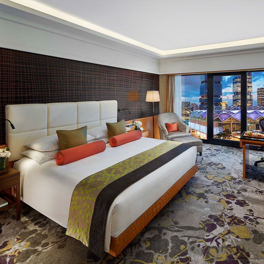 酒店拥有778间豪华客房及套房,房间设计将本土特有的文化、悠久的历史遗产元素融入其中,房间大床上方的挂画,正是新加坡各民族的特色缩影,让住客随时体验到新加坡的魅力。