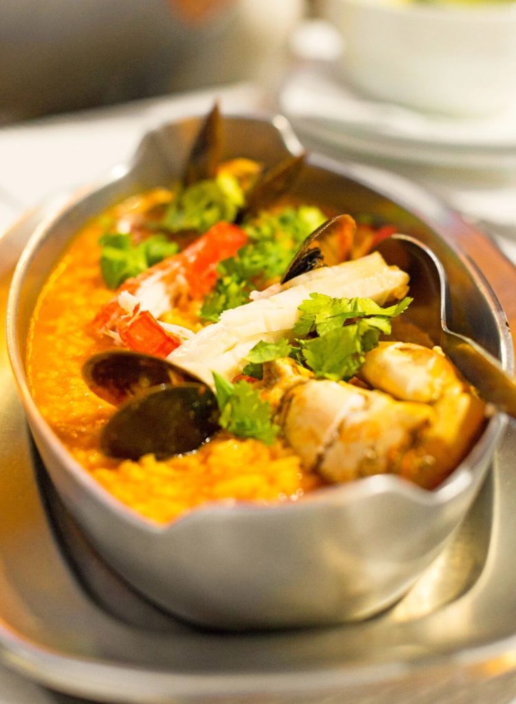 葡萄牙的西部、南部濒临大西洋,大西洋的洋流为葡萄牙人送来鲜美的海鲜,也造就了他们制作海鲜饭的精巧技艺。而澳门濒临南海,海鲜也非常新鲜,肉质弹爽。葡萄牙海鲜饭比中式炒饭更湿润些,米饭充分吸收了汤汁,有番茄和红椒的味道相佐,鲜美不腻,令人食欲大开。