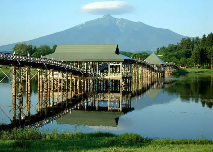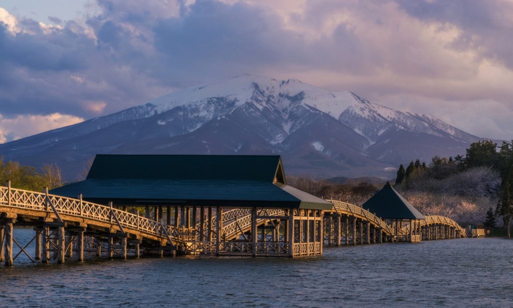 桥的设计以鹤飞翔的样子为概念,将远处的岩木山衬得别有风味。无论是黎明中浮现的桥身,或是夕阳下柔美的绝景,都让它成为镜头不可错过的景色。