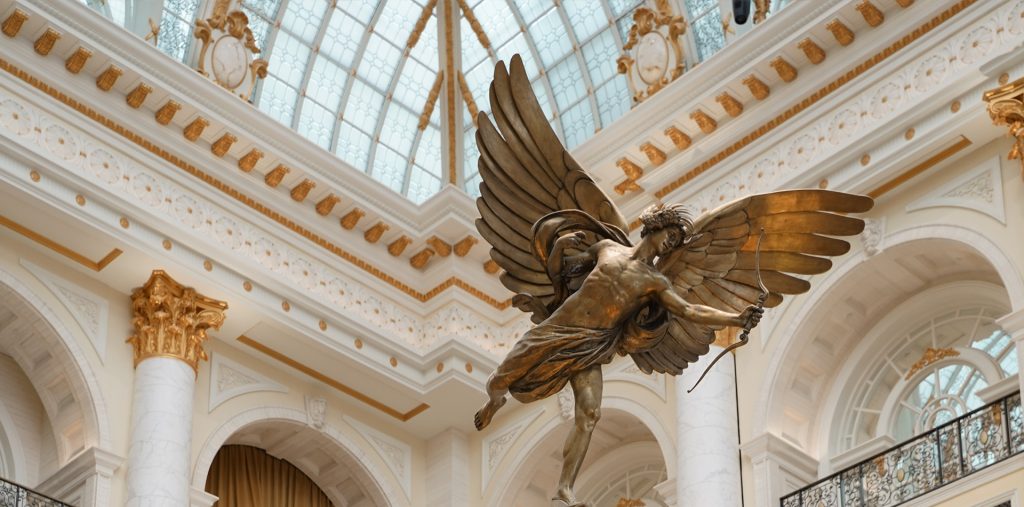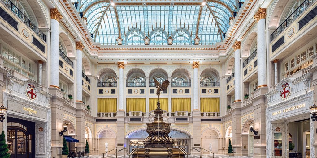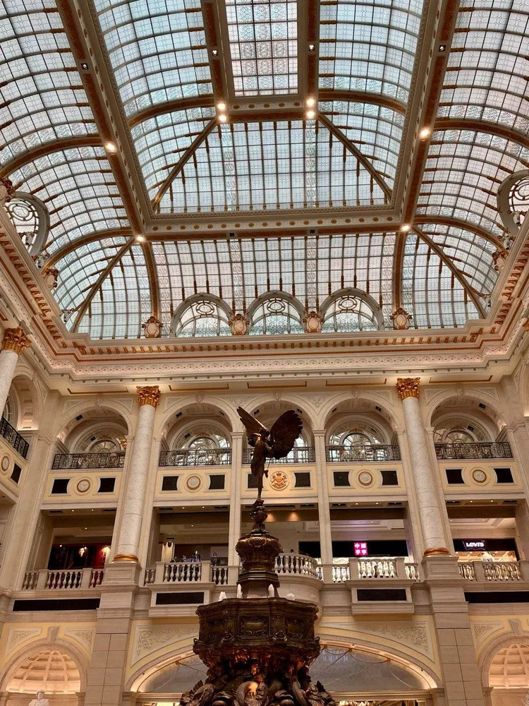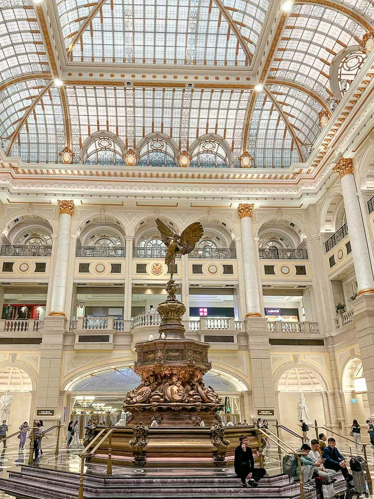 水晶金殿在伦敦人大堂,除了雕塑和奢华吊顶,还有许多美食~这是位于澳门路氹城的一座购物中心,是澳门最大的购物中心之一。水晶金殿以其华丽的设计和豪华的品牌而闻名,游客可以在这里购物、用餐和享受娱乐。