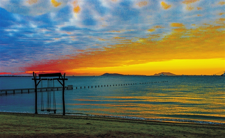 当太阳渐渐西沉,岛上的景色变得更加迷人。夕阳的余晖洒在海面上,金色的光芒与蓝色的海水相交织,形成了一幅动人的画面。这一刻,所有的疲惫与压力都随着日落的余光烟消云散,心中只剩下平静与喜悦。