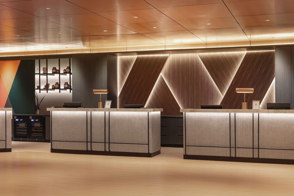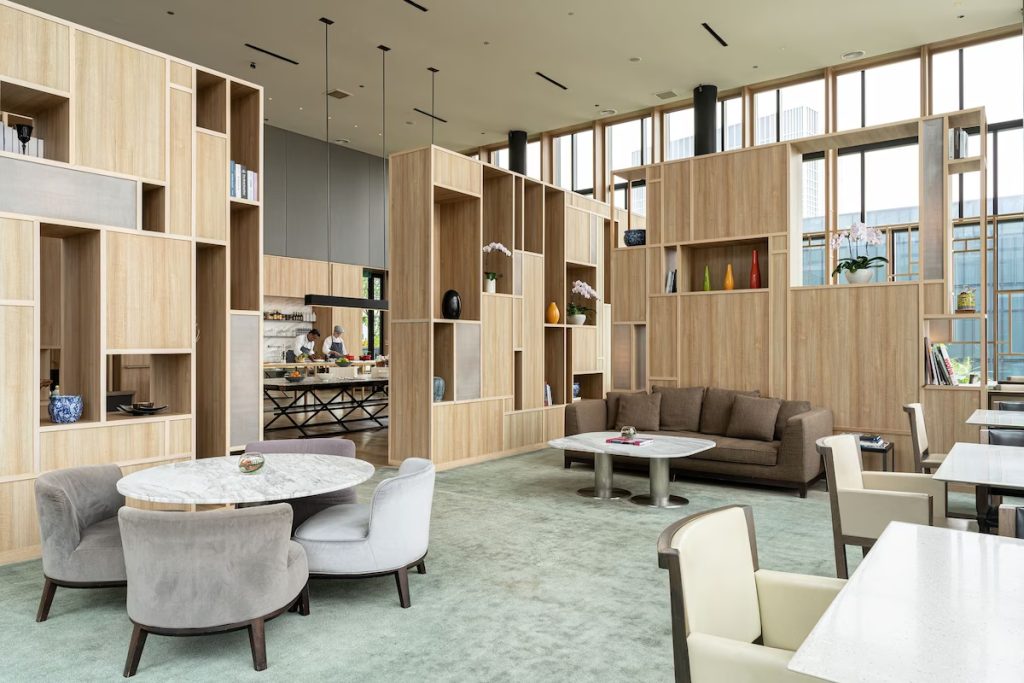 大堂的设计通过一处小店替代传统的大堂吧功能,售卖水果、简餐、零食和咖啡软饮,以提高宾客的便利性。这种设计反映了对新的酒店概念和服务需求的创新回应。