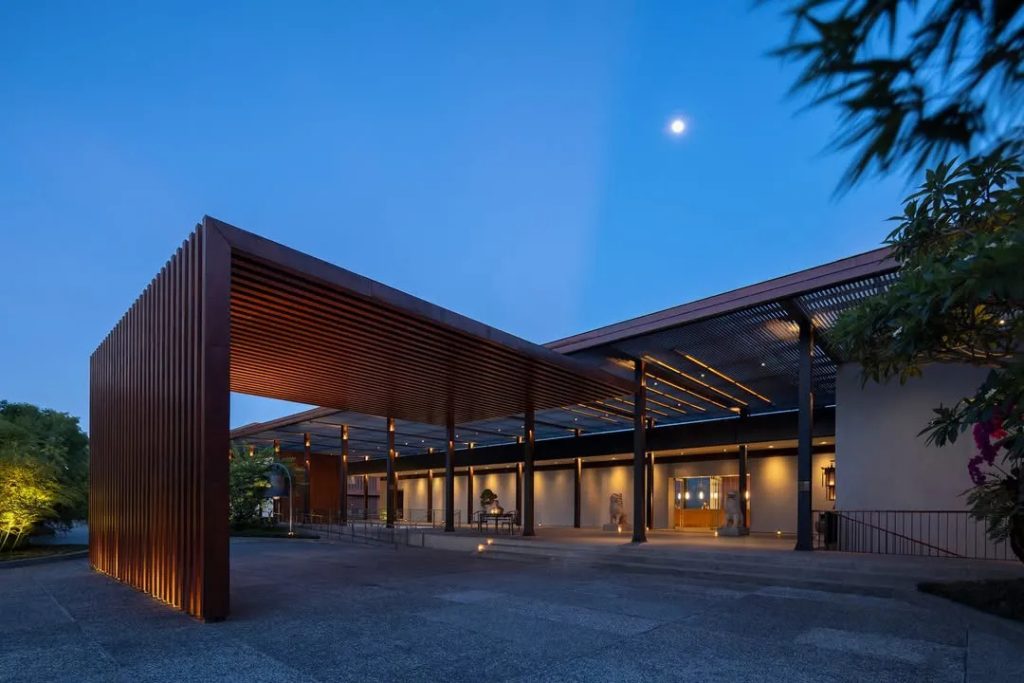 水墨画卷般的建筑风格,以群山为垂直线条,以湖面为水平线,通过极简的笔触将纵横的肌理展现至此,看似简单却有容乃大。
