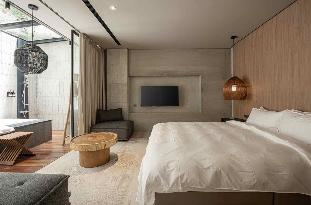 复式结构的房型,在二楼的部分则是有着24小时流动温泉,在房间内即可尽享一边观赏漫山绿意一边泡着私汤的乐趣。