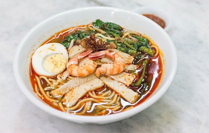 虾面是由虾和米线放在一起煮的,里头有虾仁、鱼饼、肉、墨鱼、蔬菜。面汤浓浓厚厚的,面上隐隐飘着一层红油。一口汤下去那个鲜啊。味道偏辣。虾面是东南亚料理,在新加坡和马来西亚槟城具代表性,是一道利用虾壳及辣椒熬煮的赤红辛辣汤底,再配上黄面条、米粉、虾和蕹菜等而成的面食料理,在新马各地的华人茶餐厅或美食中心都可寻其踪迹。福建虾面的汤底充满虾的鲜味及辣椒等香料的香味,在新加坡、马来西亚、泰国与印尼华人中广受欢迎。