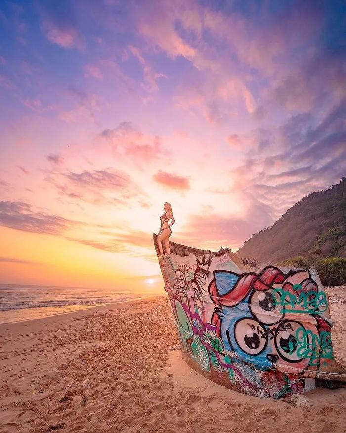 如你在照片中所见,除了美丽海景,农加兰海滩上还有一艘沉船,让这座海滩平添了许多传奇色彩。海水常年冲刷着沉船,在日月星辰变换中,船体在慢慢腐朽,但正是这种海水和时间的印记,能让照片自带时光滤镜。