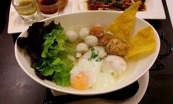 曼谷王子戏院猪肉粥主打「猪肉粥」,圆滚滚的手工猪肉丸子非常饱满,亦可选择“猪肉猪杂粥”,猪心、猪肝等皆鲜甜无腥味,撒上姜、葱增添香气,一碗只要40-45泰铢,另外加5-10泰铢,即可加入生鸡蛋或皮蛋及油条,简单美味,让人忍不住还在冒烟的烫口,就想多吃几碗。