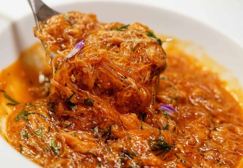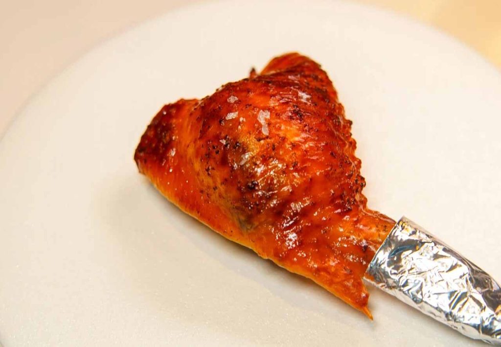 做法参考了「营致会馆」(这间餐厅后面会提到)最受欢迎的脆皮贵妃鸡,再融入了主厨 Oliver 的法式技巧,罕见地用到了乌鸡为主材,先浸泡在以金华火腿、虾米和瑶柱熬成的上汤中烹煮,再风干一日一夜后,后以高温油炸,鸡腿内还填满鸡肉和腊肠,一整个外脆里嫩,内外兼修。
