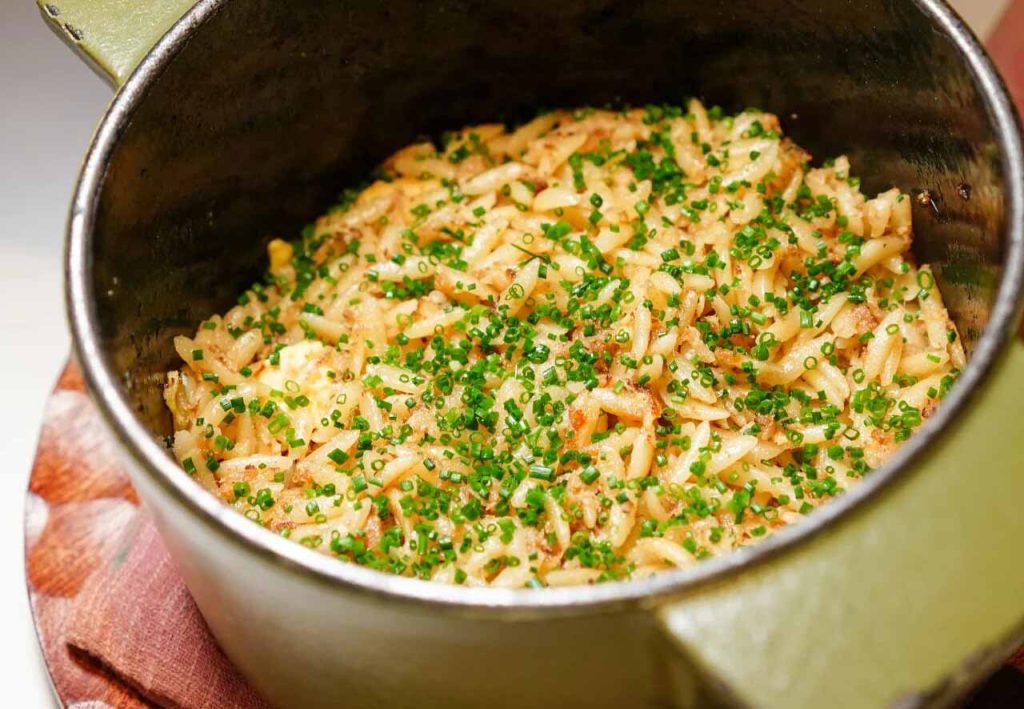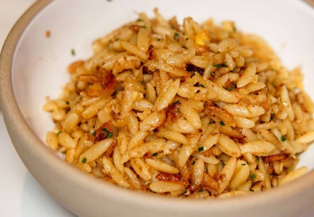 到了主食部分,也是招牌菜之一,是一道「银鱼葱炒“饭”」一锅端上桌,能看得出是从粤式炒饭里提取的灵感。
