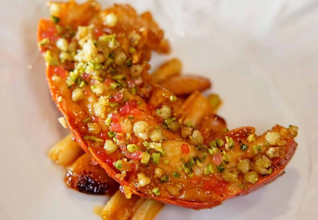 来到一道「 麻辣煎龙虾」,这道菜的灵感来自于港式家常菜「茄汁虾碌」,在调味上增加了许多细节,龙虾加入咖喱粉作底味,经油泡处理,保有爽滑弹牙的质地。