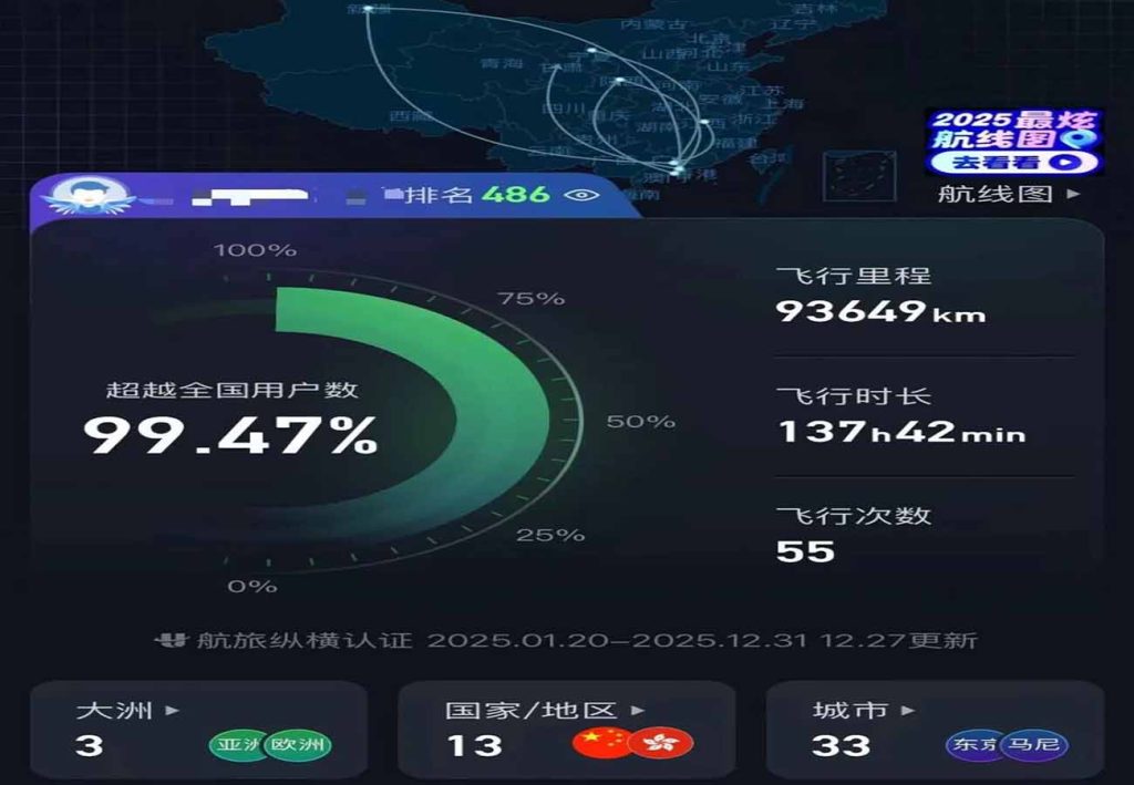 2025年我一共飞行了55次,飞行时长为137h42min,飞行里程为93649公里,在我这个小城市排名486。飞了13个国家/地区,国内外33座城市,其中去过最多的不出意料是HKG香港国际机场。