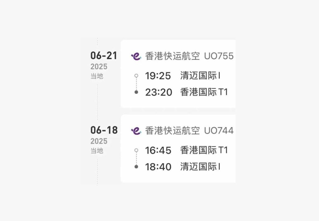 这是一套UO(香港快运航空)的票,去程是在同程当时的香港机场出发99元含税盲盒中开出来的,返程是在UO大促时281人民币拿下的,往返均不含托运与手提行李额,我只背了一个小书包去,六月的泰国平均气温都在三十度以上,带几套速干衣和几套一次性内裤袜子就可以直接出发了。很喜欢清迈,后面有机会一定还会再去很多次的。这套的时刻相对其他UO的航线算还不错了,至少去程时刻不错,落地直接去古城觅食。