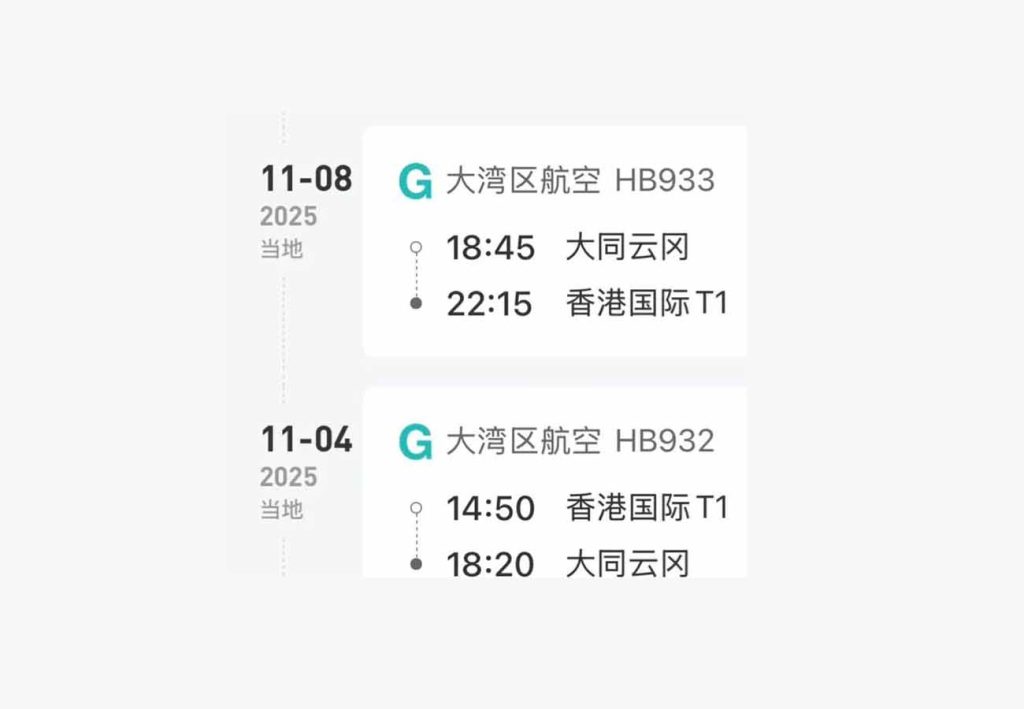 GBA(大湾区航空)算是我最期待的几家新兴航司之一了,这条香港大同是宝华国旅开的旅行社包机航线,神价一直很多。其实这趟也能算是免费出行的,因为7月GBA取消了我的航班,我和骆驼🐫客服打了55通电话最终要到了600元赔偿,相当于是送了一套往返机票还附赠400元旅行补贴。