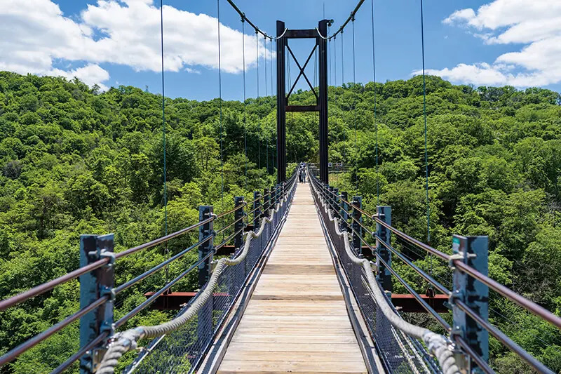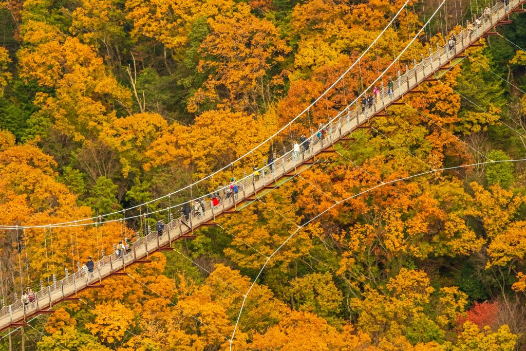 星のブランコ除了有能够远眺大阪市区的红叶山谷,最大的亮点是落差50m,全长280m的吊桥。走在吱嘎作响,摇摇晃晃的木制桥面上,俯瞰身下的红叶,刺激又惊艳。