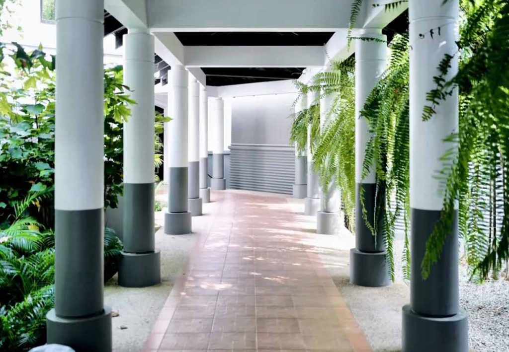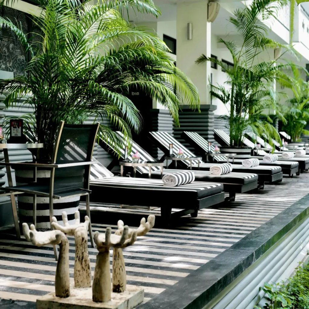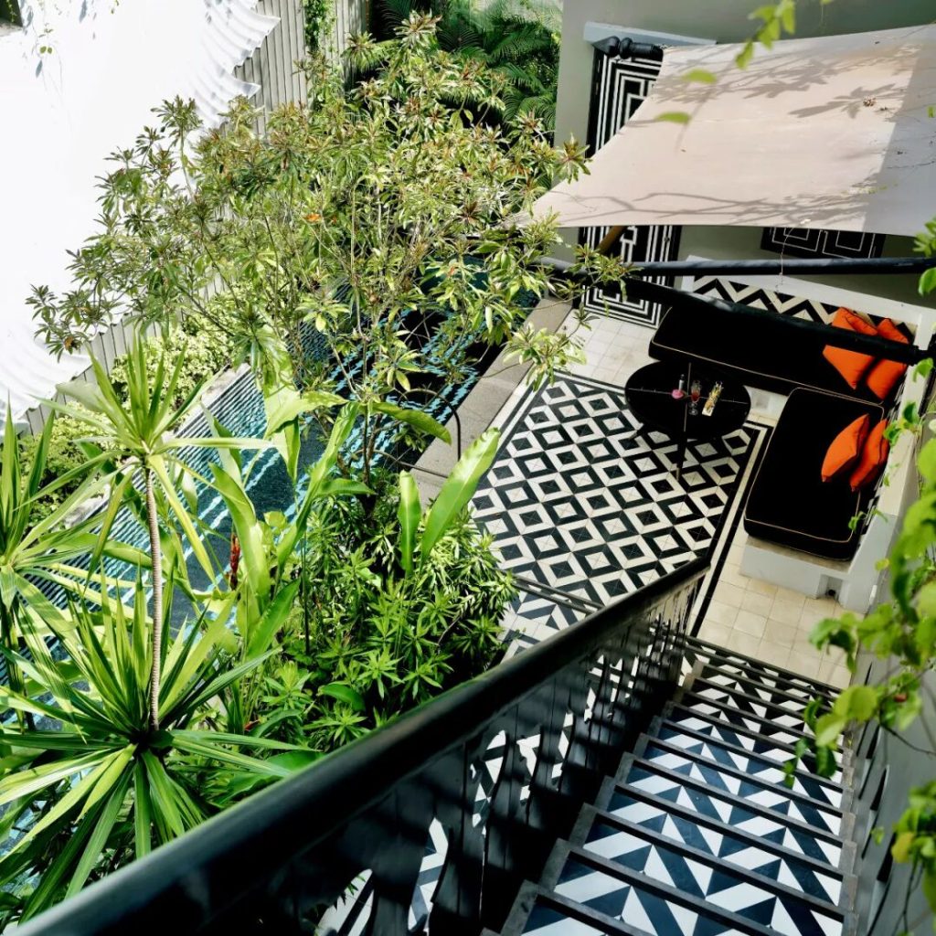 吴哥圣塔玛尼的「巴戎翼 Bayon Wing」是整座酒店中面积最开阔的翼楼,四周环绕着具有吴哥建筑风格的石墙,以及树冠如盖的棕榈树,绿意盎然氛围静谧;整座酒店共设有105间客房与套房,以及10栋私密泳池别墅,其中巴戎翼占据了最大比例,包含62间客房与4间套房,并配有专属的中庭泳池,成为整座酒店功能最为齐全、空间最为开阔的核心区域;步入其中,首先映入眼帘的便是其极具辨识度的黑白条纹与明快色彩碰撞,这种风格鲜明的设计,正是出自 Bill Bensley 之手…