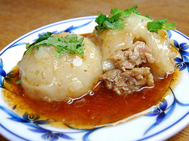 肉圆属于彰化三宝之一,一般使用最好的地瓜粉或番薯粉做成松软弹牙的外皮,包上猪肉块拌笋丁、香菇等内陷,下锅炸制后外皮Q弹,黏度刚刚好,再淋上特调的酱料,咬下去鲜甜肉香,很有台湾风味。