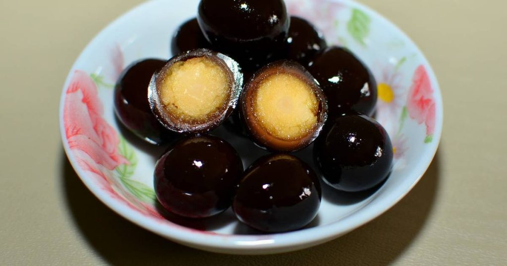 阿婆铁蛋是淡水的名小吃之一,店家每天将精选的鸡蛋或鸟蛋放入秘制的卤水中卤上三个小时,然后自然阴干,如此持续一周才算完成。这样做出来的铁蛋又黑又硬又有嚼劲,牙好的朋友一定要试试。
