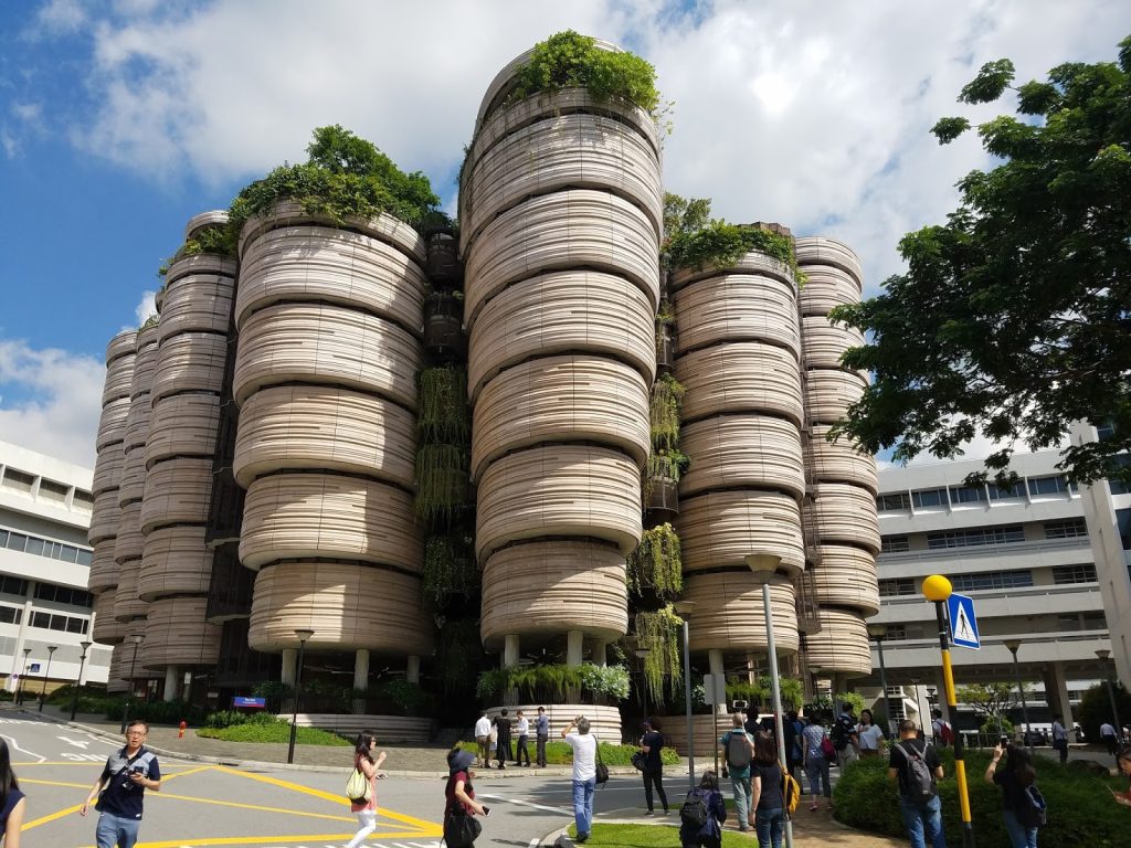 南洋理工大学习中心建筑像“蜂巢”,也称“小笼包”,是南大最有名的一道风景,也是世界级的地标性建筑。这座多功能建筑由托马斯·赫斯维克设计,占地面积为2000平方米,共有8层,可以供33000名学生使用,于2015年完工。它拥有十二个逐渐向底部收拢的塔楼,有序地环绕着一个巨大的中庭空间,提供了56个没有拐角、没有明确前后之分的教室。旨在提供一个与现代教学方式相适应的独一无二的设计。 当地的建筑法规和高标准的环境要求必须采用混凝土施工方法,因此设计的主要挑战是如何让这个不起眼的材料建成让它看上去是个很漂亮作品。建筑是在混凝土加入了颜料才得到这种特殊的浅色系;建筑没有主入口也没有大门,可以从各个方向进入中庭;开放的中庭空间使得围绕教室的空气得到最大化循环,对身处热带的新加坡来说再合适不过。