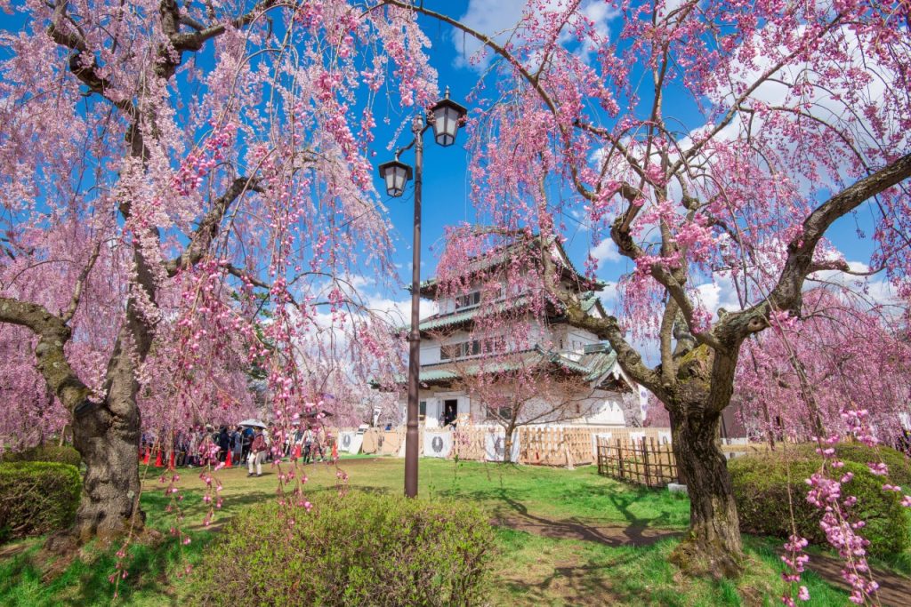 从展望台上可以同时看到岩木山、天守阁和樱花,古色古香的建筑在粉樱掩映下宛如时光倒流。花见期间还会举办弘前樱花祭,集合了日本东北的特色小吃,美食爱好者可不能错过!