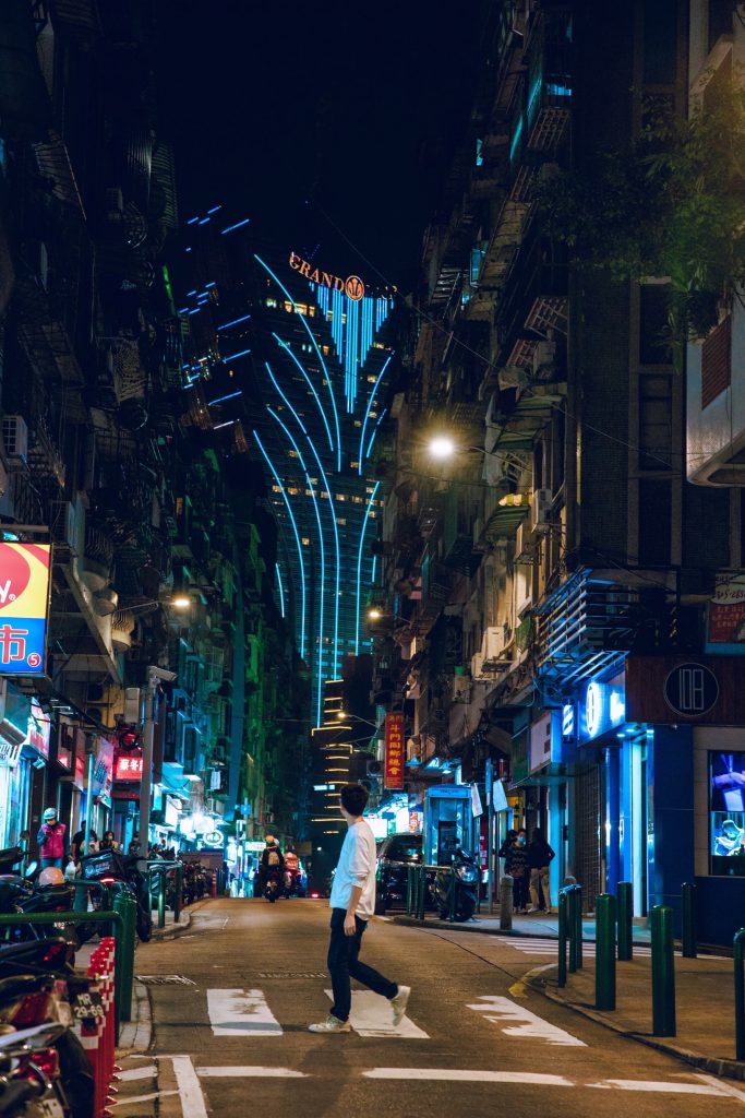 东望洋新街是国家地理杂志的同款机位,到傍晚人群较多的时候,站在这个角度能拍出赛博朋克般的照片。
