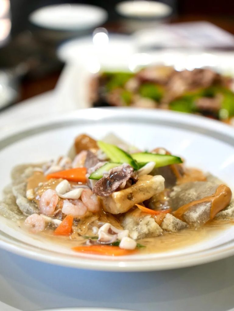 海鲜疙瘩汤是烟台家喻户晓的汤品主食。面疙瘩Q弹有嚼劲,汤底汇聚了蛤蜊、虾仁、扇贝等多种海鲜的精华,口感层次丰富,喝上一碗,舒服又暖胃。