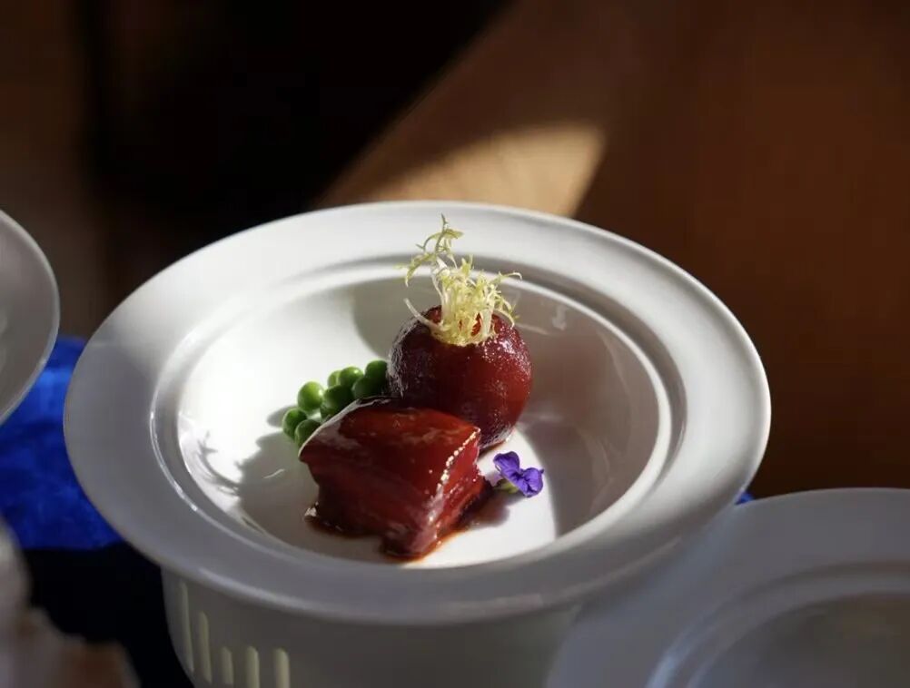 3厘米见方的块,锅中炒出糖色下入肉块翻匀放入调料,加入足量热水没过五花肉,大火烧开小火炖至软烂收汁,装盘,再配以红酒炖烂的雪梨,其特点是肉香配果香,中和了油腻感,肉质更鲜嫩,口感层次更丰富。