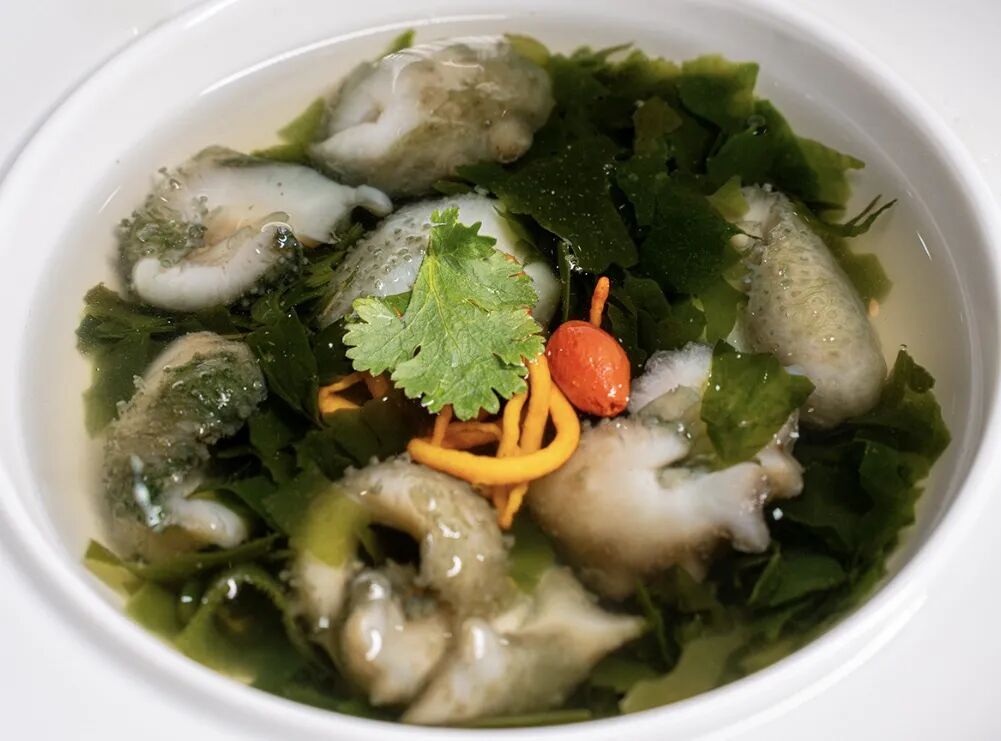 高汤冲浪海参,一款注重食材本味的创新海鲜高档菜。选用的是渤海湾的活海参,利用独到的手法将海参拉至透明状态,开水一烫切成薄片,将海参和鲜海苔一起放入碗内,浇入调好味的高汤,充分将鸡汤的香,海参海苔的鲜味融入一体,成菜方式新颖,汤沸汽腾,视觉效果和口感体验都非常完美。