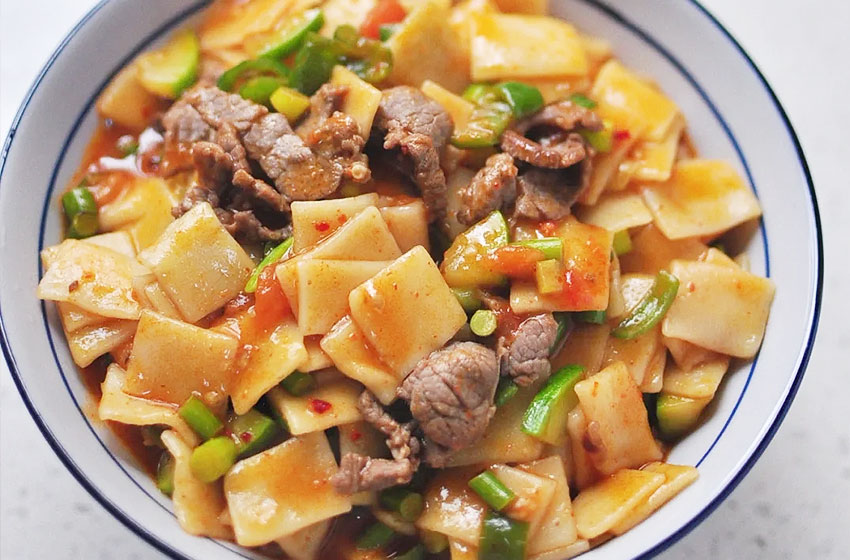 尕面片,青海人最喜欢的面食之一。可以说是青海人的家常便饭,类似于“揪面片儿”,尕面片在制作时将切成长条的面基,用手捏扁再就成指甲盖儿大小的面片,投入沸水中煮熟,再加入配料进行烩、炒,或者加入炸酱干拌食用。