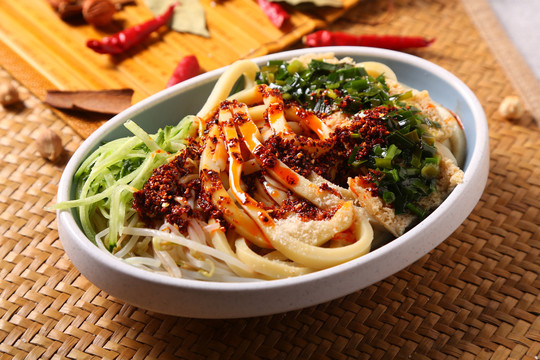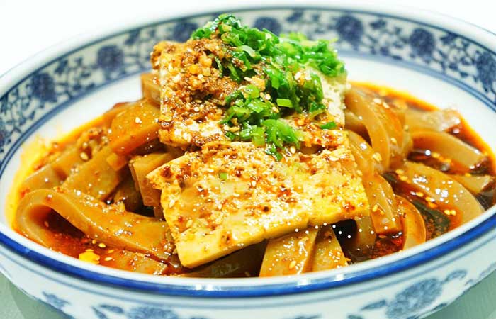 青海酿皮主要以面粉为原料,将和好的面团放入凉水中连续搓洗,洗出淀粉,留下面粉中的蛋白质,当面团成为蜂窝状物时,放进蒸笼蒸熟,就是我们常吃的“面筋”;再将沉淀好的淀粉糊置入蒸盘中蒸熟,蒸熟的面糊凝固成晶莹细腻的“蒸酿皮”。将蒸熟的酿皮从盘中剥离,切成长条,配上面筋,再浇上醋、辣油、芥茉、韭菜、蒜泥等佐料,吃起来辛辣、清爽。